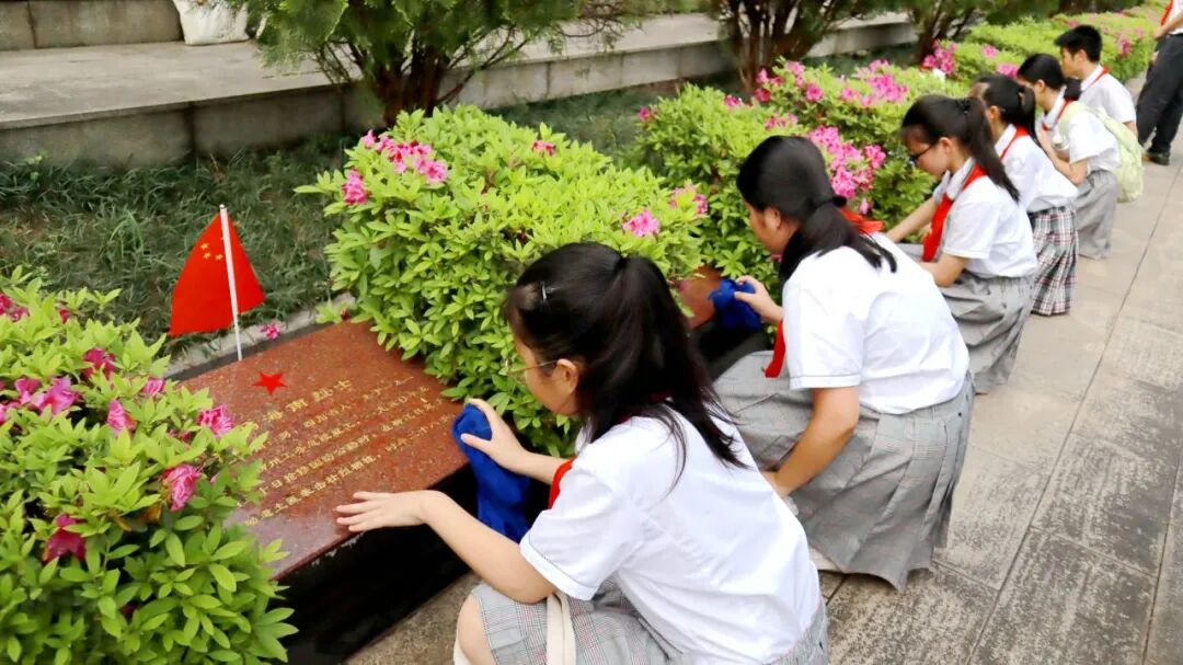 白菊朵朵溢清芬,红心灼灼敬先烈。随后,全体师生俯下身细心擦去纪念碑上的灰尘,深切表达对革命先烈的敬仰和追思。