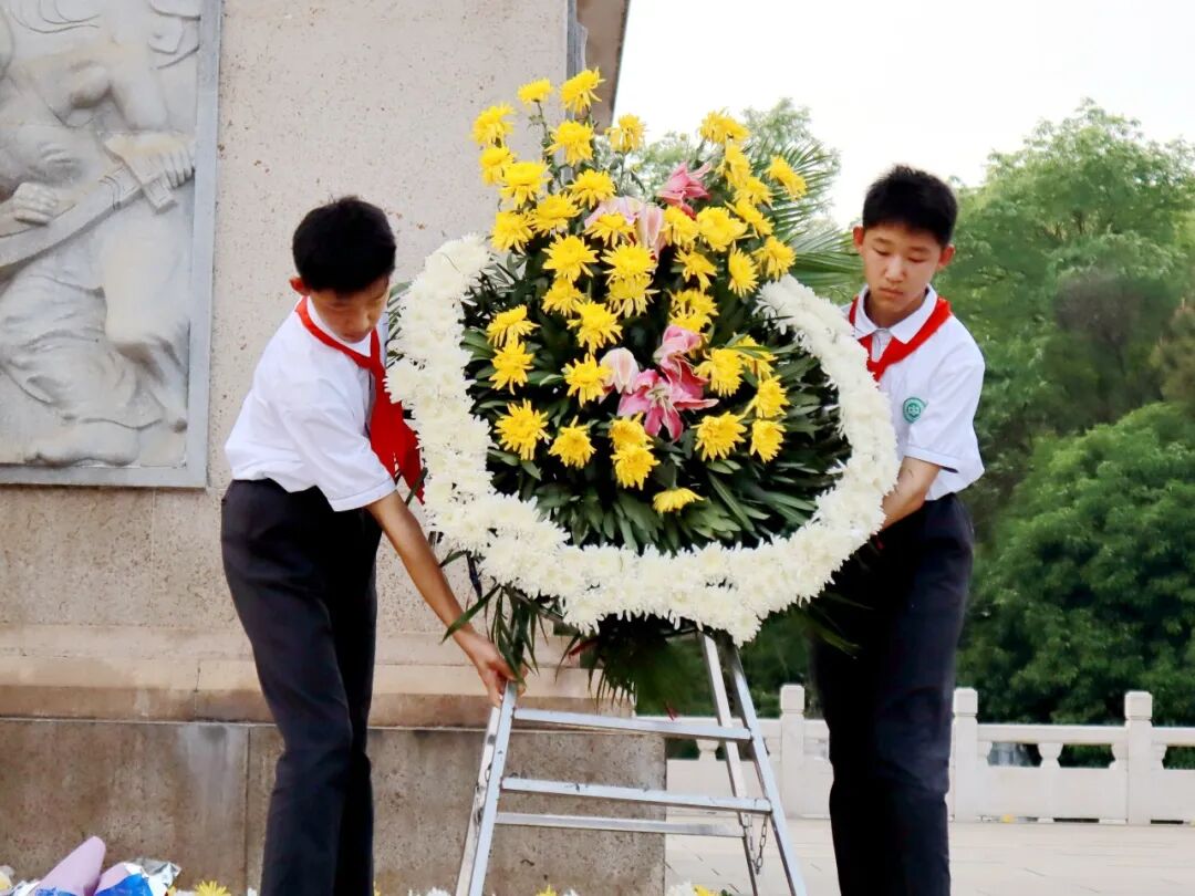 少先队员代表向革命先烈敬献花圈,寄托哀思