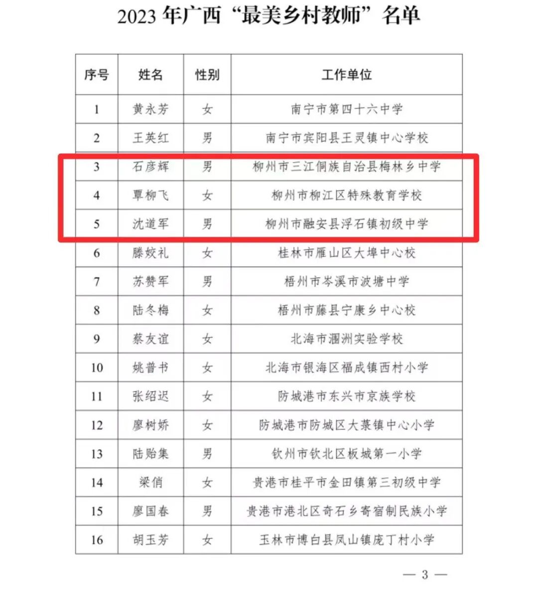 近日,2023年广西“最美乡村教师”名单公布,共有30名教师入选。其中,我市3名教师上榜,分别三江侗族自治县梅林乡中学教师石彦辉、柳江区特殊教育学校教师覃柳飞、融安县浮石镇初级中学教师沈道军。